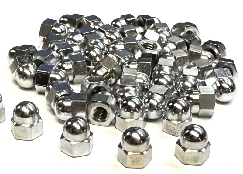 Valve Cover Acorn Nuts (M6) (Stainless steel, original 1pc style)-1600/2002, Bavaria/CS, 320i (77-81), 530i/528i (75-83) etc - I must have put these aside for personal use 25 years ago as they were not on my parts list. The new part (# 11617549043) is a plain finish acorn nut with a washer tacked onto the bottom. I'm selling the original 1pc design with a bright "chrome like" finish in A2 stainless. |