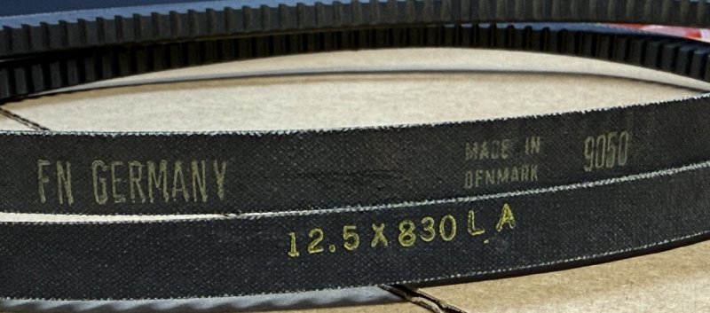 FAN BELT (marked FN Germany)(Made in Denmark) - size is 12.5x830. European quality. Interchangeable alternate for a 12.5x825, 12.5x835, 13x825, 13x830 and 13x835.