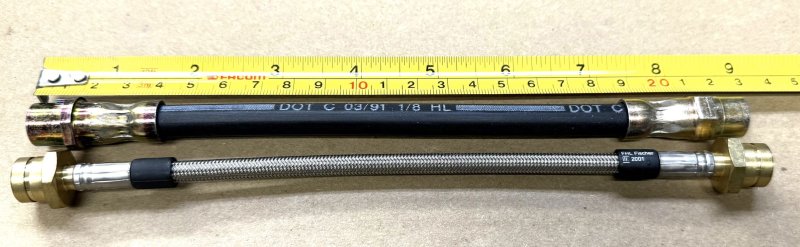 Brake Hose (Rear Intermediate) - 318i/323i/325i/328i/M3 (92-99) (Genuine BMW) . Tip to tip length is 225mm of the hose I have. Ends are both M10x1.0 female. I also have a few pair of high quality Fischer stainless steel lines (made in Germany) listed separately. This listing is for the single factory rubber hose. |
