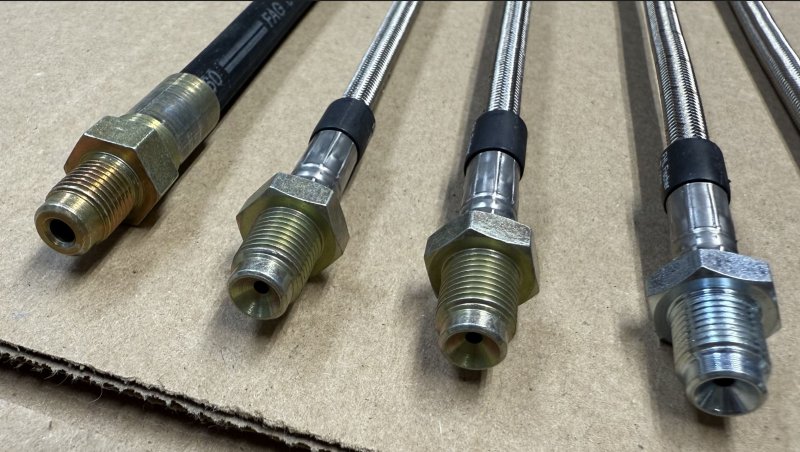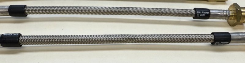 Brake Hose (Rear)(L=various) - Bavaria, E21, E12, E30, E36, E23, E24, E28, E32, E34 (1969-2002) Sources say L=200mm length but the 226mm I get is from tip to tip. One end is M10x1.0 female, the other M10x1.0 male. Brake Hose (Rear Intermediate) - 318i/323i/325i/328i/M3 (92-99) - pair of Fischer-Hydraulic stainless steel lines with M10x1.0 female ends. Made in Germany. I have one that measures 228mm, two measure 230mm and 1 measures 250mm. Your choice. Note, one of the 230mm lines has a slight dent in the outer sheathing (see photo) that does not affect internal flow. This hose is $20 instead of $30. |