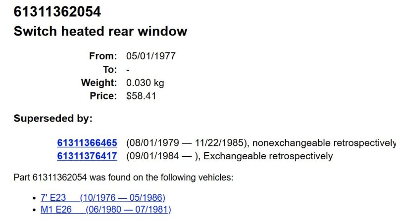 Defroster Switch-733i (78-79) (E23) & M1 (6/80-7/81) - may fit later 733i/735i models. Deep discount. Part is possibly NLA at the dealer.Take another 20% discount for 5pc or more. |