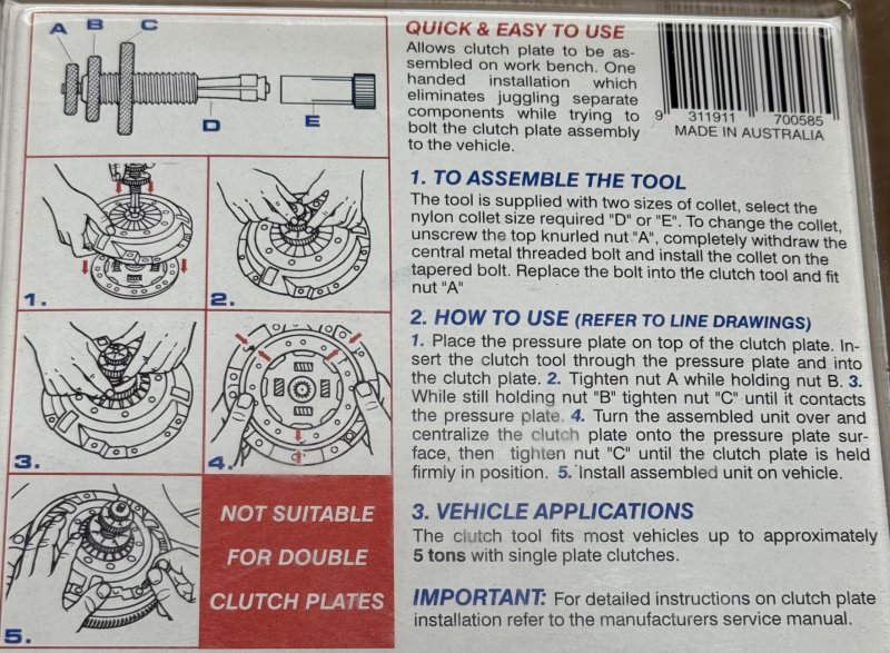 ABW Universal Clutch Alignment Tool - inexpensive DYI tool made of reinforced nylon and steel. When I purchased these 25+ years ago, they were being made in Australia. Production has since shifted to Taiwan and/or China. I see these online for $18.99 to $87.50. Priced to sell at under $10.