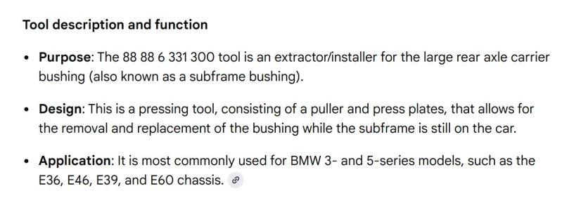 I asked Google AI what this tools was for and it printed out the attached (see last photo). I believe I purchased this and the attachments for E36 bushings but that was 20+ years ago and I don't recall. The attachments are still in the sealed bags and the puller has never been used. (5B)