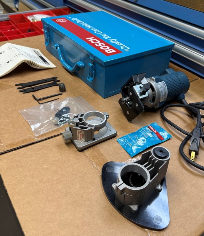 BOSCH 1609 Laminate Trimmer INSTALLER'S KIT w/3 Bases in Metal Case - used 2-3 times for simple tasks. 2 of the 3 bases have never been used. Made in USA. Tested. Like new! (base2-rk14) |