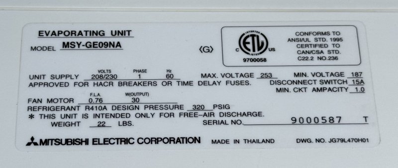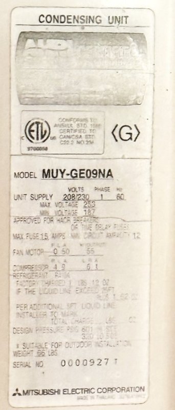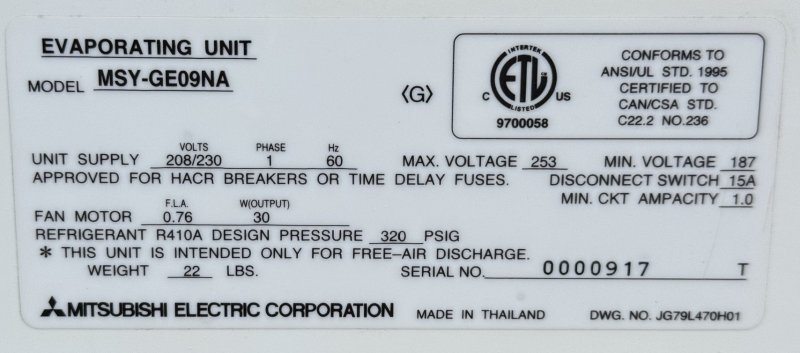 Mr Slim 9,000 btu Seer 21 Mini-split Air Conditioner (R410a) - indoor unit is MSY-GEO9NA and outdoor unit is MUY-GEO9NA. These were replaced with heat pumps 2 years ago. They were working perfectly....we just wanted "heat" to go with the AC. This is not a 2 zone unit....it is 2 different units than can be placed apart or in different residences. If you have one or more of these units in service, this is a good spare to have.
