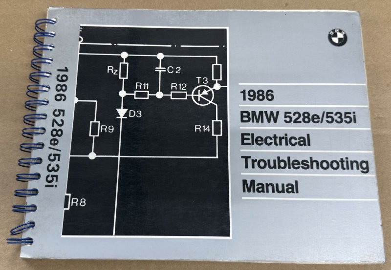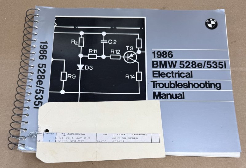 Electrical Troubleshooting Manual-1986 BMW 528e/535i - new/old stock (still has the inventory tag on the manual). Approx 1" thick. I suspect this manual will be helpful for 1985 models and 1987 cars too. With labor rates what they are today, if it helps you with one diagnosis or repair, it's paid for itself. |