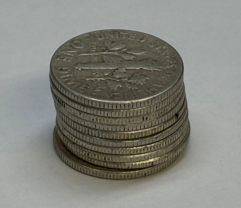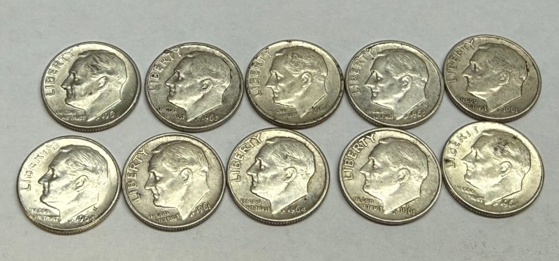 Silver Roosevelt Dimes (various dates) - 10pc ($1.00 face value) - these are the 1964 and earlier - 90% silver - photo is what will be shipping upon purchase.